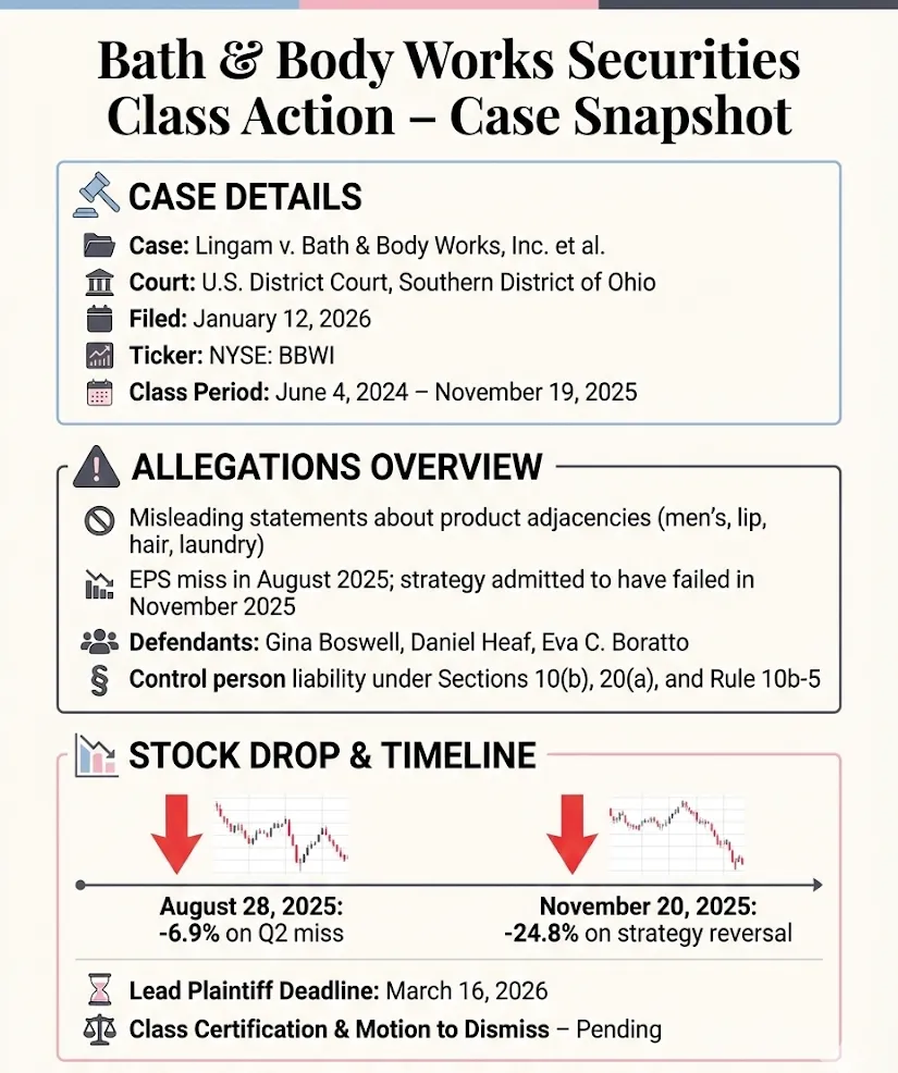 A federal securities fraud class action asserted under Sections 10(b) and 20(a) of the Securities Exchange Act of 1934 and Rule 10b-5 has been filed against Bath & Body Works, Inc. (NYSE: BBWI), on behalf of all persons and entities that purchased or otherwise acquired its securities (including common stock trading on the NYSE under ticker BBWI) between June 4, 2024 and November 19, 2025, inclusive. Investors allege the company and senior executives misrepresented, through material misstatements and omissions, that "adjacent" categories-men's, lip, hair, and laundry-were driving growth and expanding the customer base. During the period, management repeatedly touted adjacencies and collaborations and promotional activities as proof of momentum. The story unraveled when results missed guidance for earnings per share (EPS) in August 2025 and, in November 2025, the company admitted the adjacencies strategy had not grown its total customer base and had diverted focus from core categories. Investors saw sharp stock declines on these disclosures.