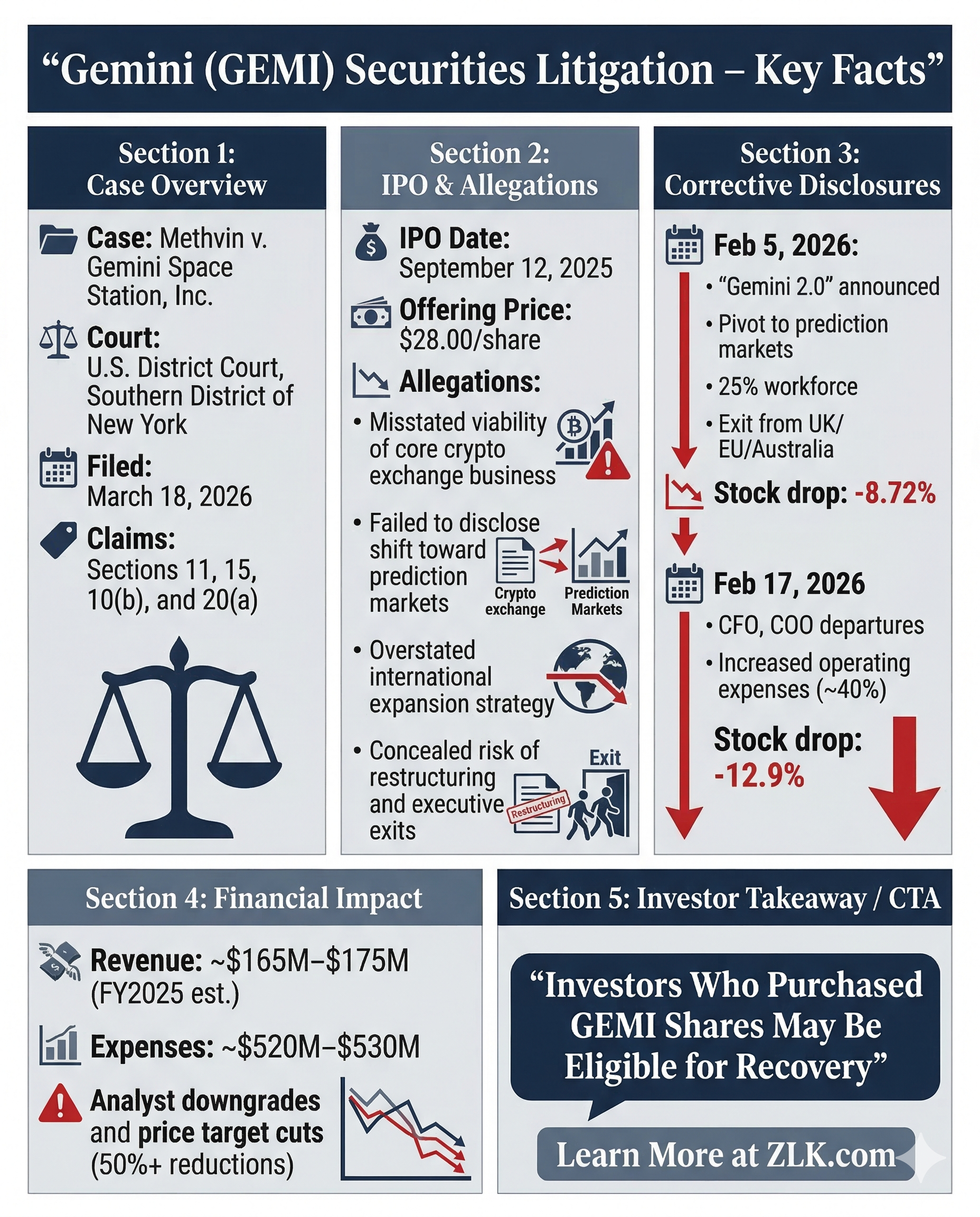 A securities fraud class action has been filed against Gemini Space Station, Inc. (NASDAQ: GEMI) alleging violations of Sections 11 and 15 of the Securities Act of 1933, and Sections 10(b) and 20(a) of the Securities Exchange Act of 1934 in connection with its September 12, 2025 initial public offering and subsequent trading through February 17, 2026, on the NASDAQ Global Select Market under ticker symbol GEMI. The company sold 15,178,572 shares of Class A common stock at $28.00 per share in the IPO. Investors allege that Gemini misrepresented the viability of its core cryptocurrency platform business and its commitment to international expansion from the IPO through the class period. Within five months of going public, the company announced a dramatic corporate pivot, slashed its workforce by 25%, and abandoned the very international markets it had touted as central to growth. Shares fell to $6.585, a decline of approximately 76.5% from the offering price.