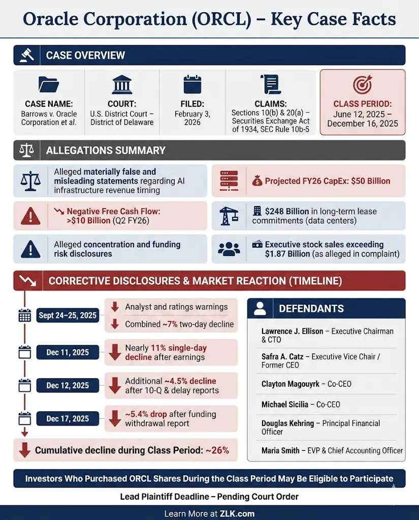 A federal securities fraud class action has been filed against Oracle Corporation (NYSE: ORCL) in the U.S. District Court for the District of Delaware, alleging violations of Sections 10(b) and 20(a) of the Securities Exchange Act of 1934. The case covers investors who acquired Oracle common stock (NYSE: ORCL) between June 12, 2025 and December 16, 2025, inclusive. Investors allege Oracle and senior executives misled the market by touting AI data center and artificial intelligence infrastructure contracts and assuring that heavy capital spending would quickly drive accelerating revenue and profit growth.
