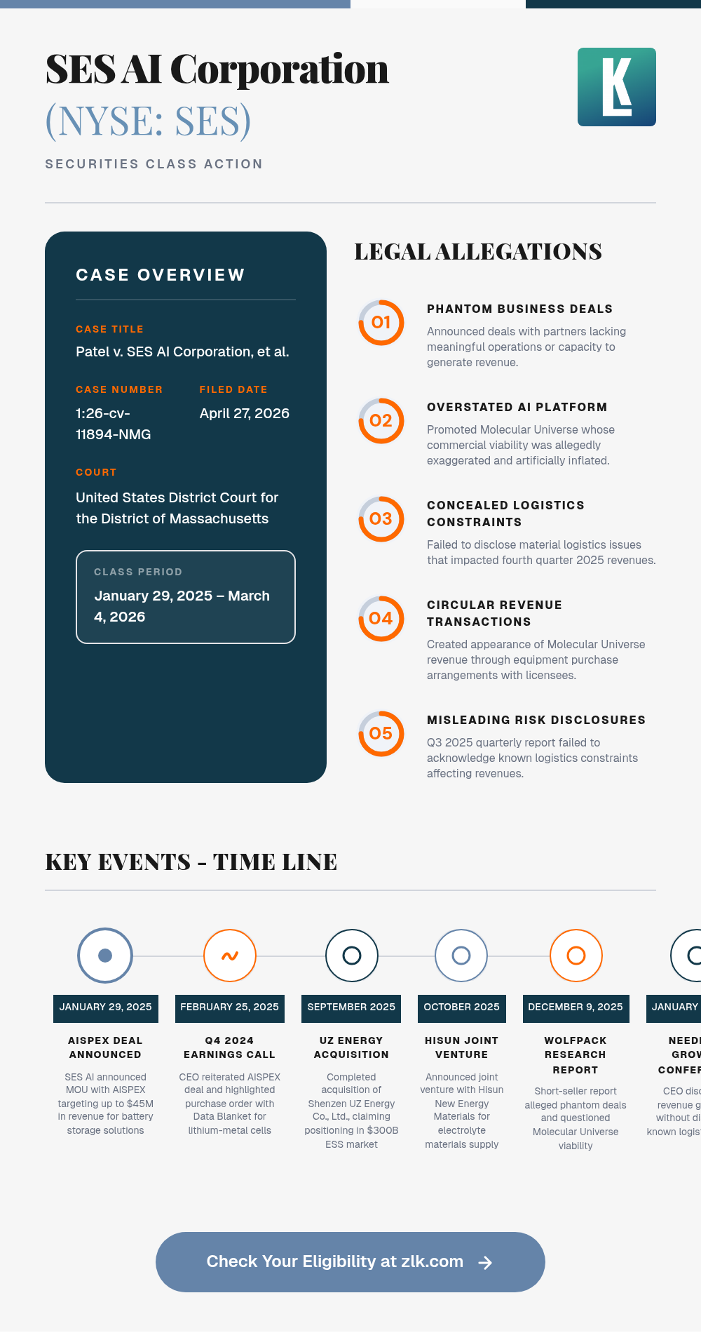 A securities class action lawsuit has been filed against SES AI Corporation (NYSE: SES) and its CEO Qichao Hu on behalf of investors who purchased SES AI securities between January 29, 2025 and March 4, 2026. The complaint alleges that throughout the Class Period, defendants made materially false and misleading statements about SES AI's business prospects, overstating the expected results of deals with companies that had limited or no meaningful operations, while concealing material logistics constraints that impacted fourth quarter 2025 revenues. When the Company reported fourth quarter 2025 results on March 4, 2026 and issued 2026 revenue guidance of $30 million to $35 million, far below the $51.67 million analysts expected, the stock plunged. On March 5, 2026, SES shares fell $0.63 per share, or 36.8%, to close at $1.08. Investors allege this decline caused losses for shareholders who purchased SES securities at artificially inflated prices.
