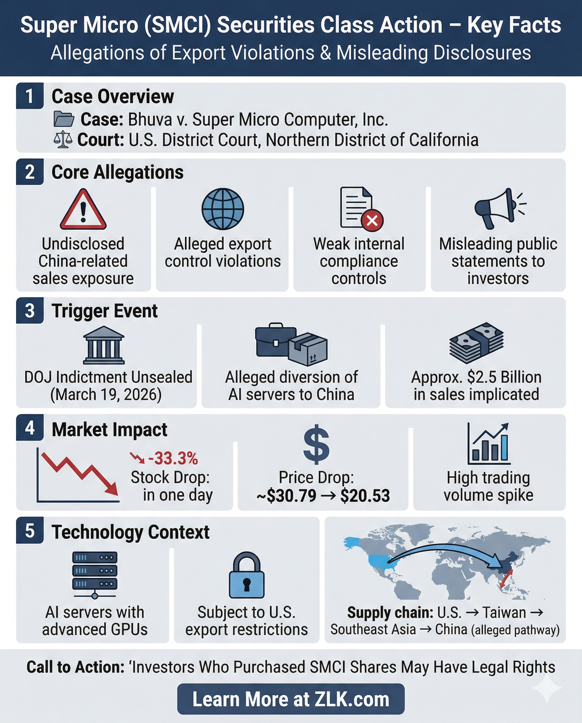 A securities fraud class action has been filed against Super Micro Computer, Inc. (NASDAQ: SMCI), asserting claims under Sections 10(b) and 20(a) of the Securities Exchange Act of 1934 and Rule 10b-5, in the U.S. District Court for the Northern District of California on behalf of investors who purchased or acquired the company’s securities between February 2, 2024 and March 19, 2026. Investors allege that Super Micro and its executives made materially false or misleading statements, and failed to disclose that a significant portion of the Company’s server sales were to China-based companies, that those transactions violated U.S. export control laws, and that there were material weaknesses in the Company’s controls to ensure compliance with those laws and regulations. On March 19, 2026, the U.S. Justice Department announced criminal indictments alleging that approximately $2.5 billion worth of servers housing U.S. artificial intelligence technology were diverted to customers in China in violation of U.S. export control laws. The next day, Super Micro’s stock fell 33.3% to $20.53 per share amid unusually heavy trading.