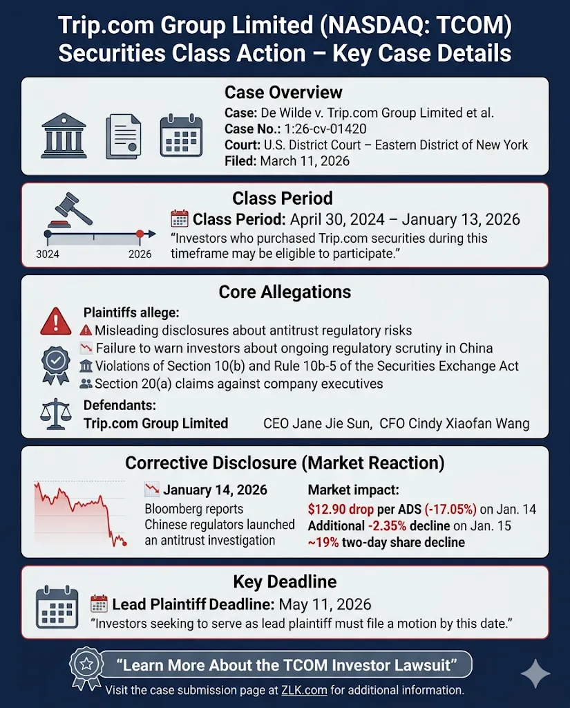 A securities fraud class action under the Securities Exchange Act of 1934 has been filed against Trip.com Group Limited (NASDAQ: TCOM) and two executives for alleged misrepresentations during the period from April 30, 2024 to January 13, 2026. Investors allege that the company and its leadership understated the regulatory risks facing Trip.com stemming from monopolistic business practices and antitrust violations. On January 14, 2026, Bloomberg reported that China’s State Administration for Market Regulation had launched an antitrust investigation into Trip.com, accusing the company of abusing its market position and engaging in monopolistic practices. According to the complaint, the news was followed by a two-day decline in Trip.com’s ADS price.