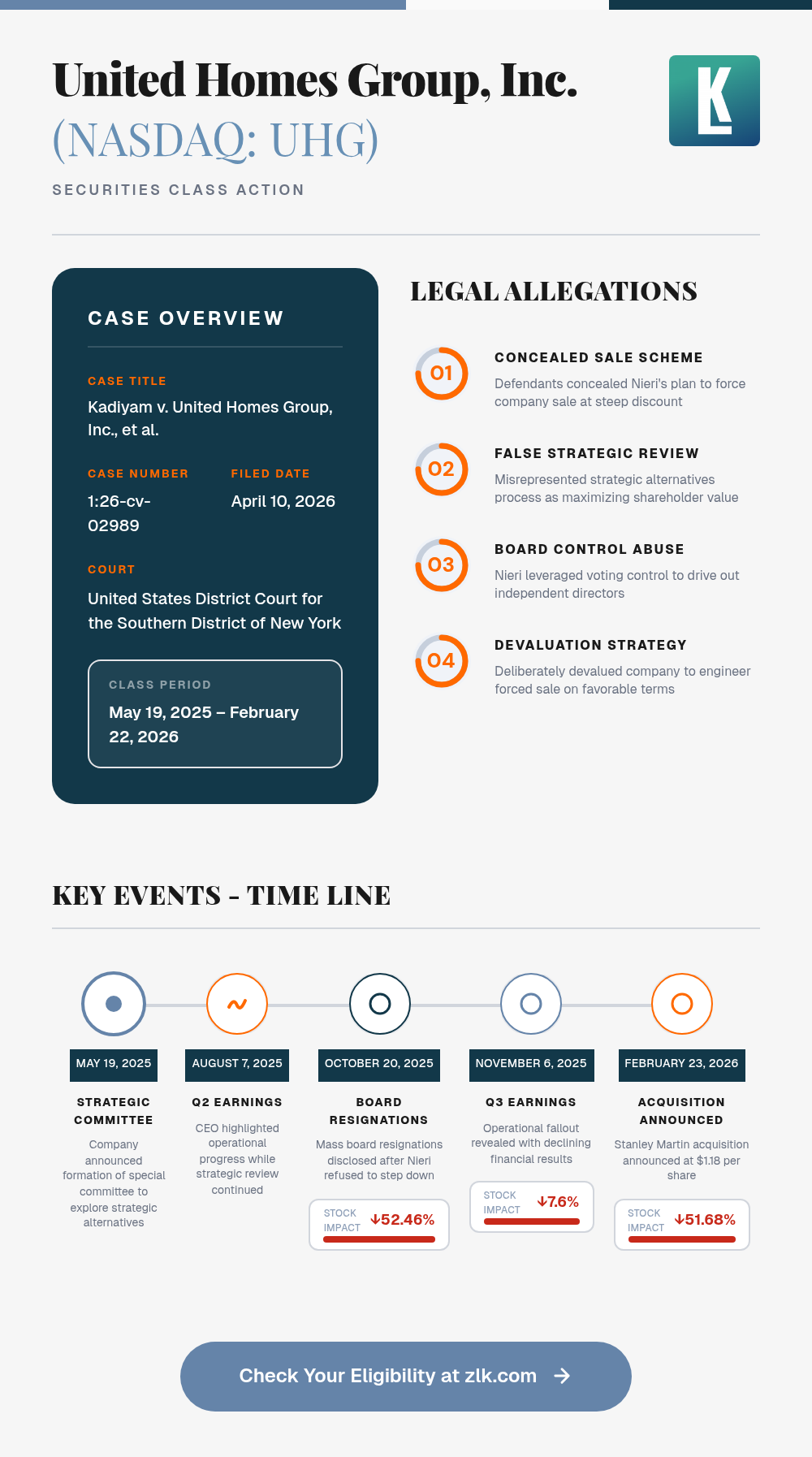 A securities class action lawsuit has been filed against United Homes Group, Inc. (NASDAQ: UHG) and certain of its current and former executives in the United States District Court for the Southern District of New York. The complaint alleges violations of Sections 10(b) and 20(a) of the Securities Exchange Act of 1934 on behalf of investors who purchased or acquired United Homes securities between May 19, 2025 and February 22, 2026. The lawsuit alleges that defendants made materially false and misleading statements by concealing that the Company's controlling shareholder, founder Michael Nieri, was pursuing a course of conduct designed to force a sale of the Company at a steep discount to shareholders, including by effectively driving the resignation of six of seven board members and leveraging his controlling interest to devalue the Company. When the full scope of Nieri's alleged scheme was revealed through a series of disclosures culminating in a February 2026 acquisition announcement at $1.18 per share, an over 50% discount to the prior trading price, United Homes' stock suffered devastating cumulative losses.