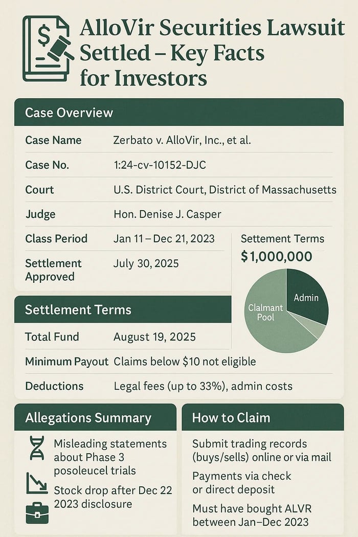 The case kicked off in early 2024. AlloVir and its executives tried to get the lawsuit thrown out. The court hadn’t ruled when the parties started talking settlement. Early mediation didn’t pan out. A second round, however, led to a deal: a $1 million cash settlement. Judge Casper gave it a preliminary green light on April 23, 2025, and finalized approval after a fairness hearing on July 30, 2025.