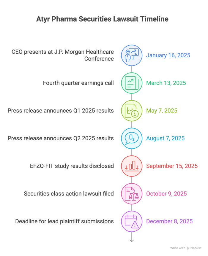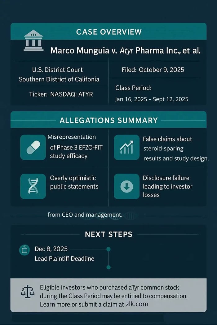 A federal securities class action has been filed against Atyr Pharma Inc. (NASDAQ: ATYR) covering January 16, 2025 to September 12, 2025, inclusive. Investors allege the company and its CEO misrepresented the efficacy of Efzofitimod and the Phase 3 EFZO-FIT study, especially around steroid reduction and the prospect of eliminating steroids. The complaint says defendants paired upbeat messaging with omissions about study design and factors that could enable steroid withdrawal independent of treatment. On September 15, 2025, Atyr disclosed that EFZO-FIT failed to meet its primary endpoint of change from baseline in mean daily oral corticosteroid dose at week 48. Following the disclosure, investors who bought during the class period allegedly suffered significant losses.