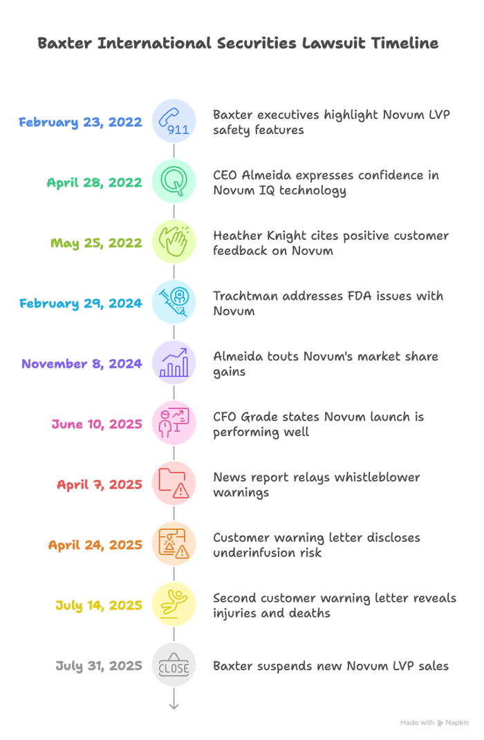 According to the complaint, the truth began to surface on April 7, 2025, when a news report relayed a whistleblower's warnings from BJC Health System about inaccurate infusion rates with the Novum LVP. On April 24, 2025, a customer warning letter disclosed an underinfusion risk and reported one serious injury tied to the issue. The narrative escalated on July 14, 2025, when Baxter issued a second customer warning letter revealing 79 reports of serious injury and two reports of patient deaths related to the Novum LVP.