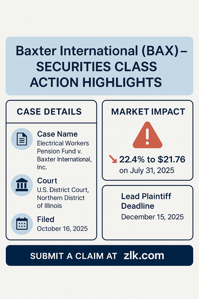 A securities fraud class action has been filed against Baxter International, Inc. (NYSE: BAX) on behalf of investors who purchased Baxter common stock between February 23, 2022 and July 30, 2025, inclusive. Investors allege the company and its senior executives misrepresented the safety, performance, and rollout of the Novum large volume infusion pump (LVP), despite systemic defects that caused underinfusion, overinfusion, and complete non-delivery of fluids. According to the complaint, concerns later surfaced through a whistleblower report, customer warning letters acknowledging injuries and deaths, and an abrupt suspension of all new Novum LVP sales. On the last disclosure, Baxter's stock fell sharply, closing down 22.4 percent at $21.76 on July 31, 2025. The lawsuit seeks to recover losses allegedly caused by these revelations.
