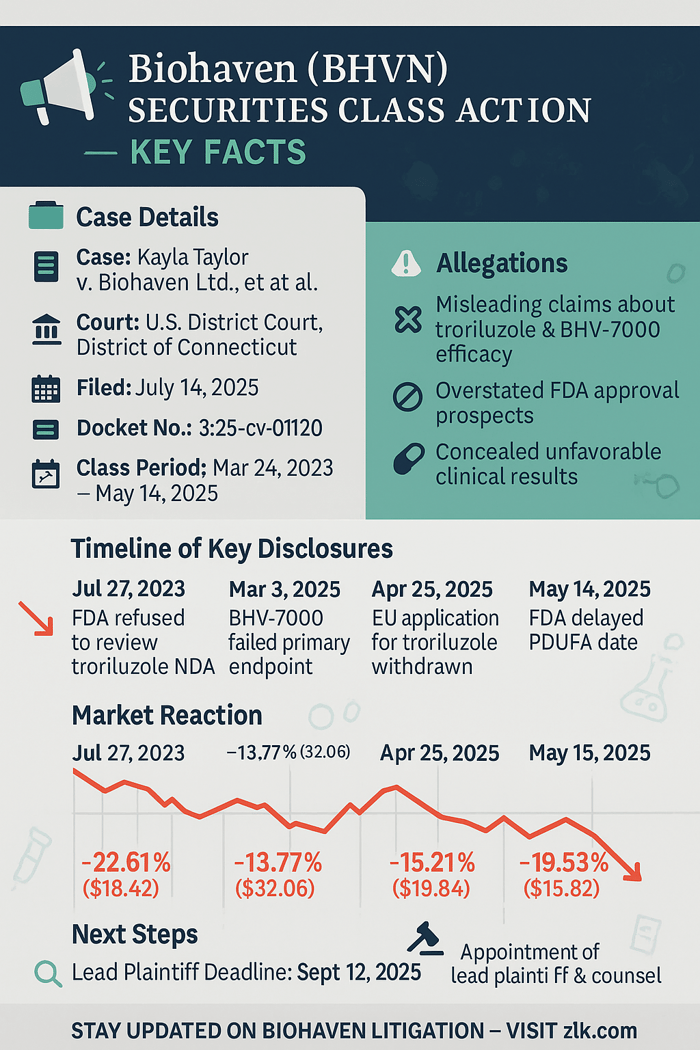 Biohaven Ltd. (NYSE: BHVN) has been hit with a securities class action lawsuit. The case represents investors who purchased or otherwise acquired Biohaven securities between March 24, 2023 and May 14, 2025 (the “Class Period”). The complaint alleges Biohaven and some of its executives ran afoul of federal securities laws based on materially false and misleading statements made about the company's business prospects.