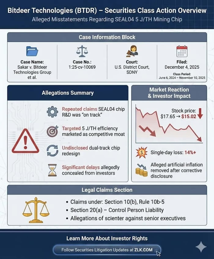 A seismic event in the Bitcoin mining sector has given rise to a new securities class action: Ismail N. Sakar v. Bitdeer Technologies Group, et al., filed in the Southern District of New York. The lawsuit targets Bitdeer Technologies Group (BTDR) and three key executives—CEO Jihan Wu, CBO Matt Linghui Kong, and CSO Haris Basit—for allegedly concealing critical development issues surrounding the company’s next-generation SEALMINER A4 mining rig.