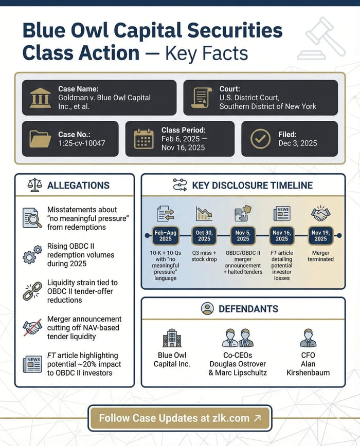 The lawsuit targets Blue Owl Capital Inc. and executives Douglas I. Ostrover (Co-Chief Executive Officer), Marc S. Lipschultz (Co-Chief Executive Officer), and Alan Kirshenbaum (Chief Financial Officer). According to the complaint, under the federal securities laws, they told investors during the class period that redemptions were not meaningfully pressuring the company's asset base and that liquidity was sufficient, while promoting the strength of the credit portfolio.