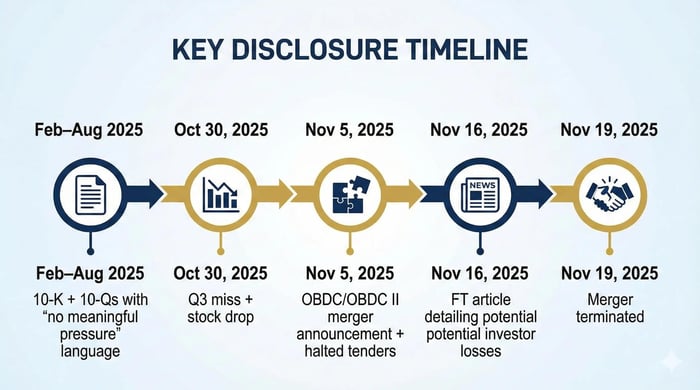 Days later, on November 5, 2025, Blue Owl's listed BDC, OBDC, and OBDC II announced a merger agreement that revealed OBDC II did not anticipate conducting additional quarterly tender offers prior to closing, effectively blocking redemptions and signaling a tender offer suspension. The narrative culminated on November 16, 2025, when the Financial Times reported that OBDC II investors would be blocked from redemptions until the merger completed and could face a reduction in investment value (a NAV discount of approximately 20%). The article also disclosed that investors had pulled $150 million from OBDC II through the first nine months of 2025, a 20% increase from the prior year (i.e., redemptions), and quoted OBDC's CFO Jonathan Lamm acknowledging that if shareholders voted down the deal, OBDC II might be forced to limit redemptions (a potential tender offer suspension) and that investors could take a haircut. These revelations cut against earlier assurances of sufficient liquidity that the company had cited to describe a lack of pressure on its asset base.