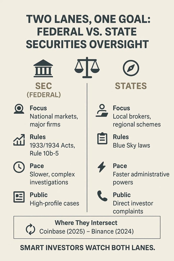 States don’t just shadow the feds—they sometimes run alongside them, in parallel. That can happen when a single securities scheme crosses both state and federal lines. One recent example involves Binance, the crypto exchange.