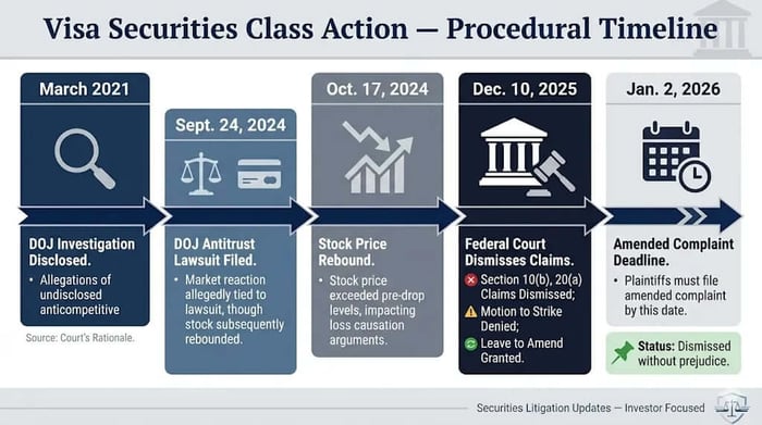 Loss Causation: The Court held that plaintiffs failed to plead a causal connection between the alleged misrepresentations and the economic loss. The Judge noted that the DOJ investigation had been disclosed to investors since March 2021, undermining the argument that the 2024 lawsuit revealed previously concealed facts. Furthermore, the Court found that Visa's stock price rebounded quickly, surpassing pre-drop levels by October 17, 2024. This sustained recovery refuted the inference that the alleged fraud caused the loss.