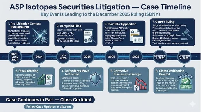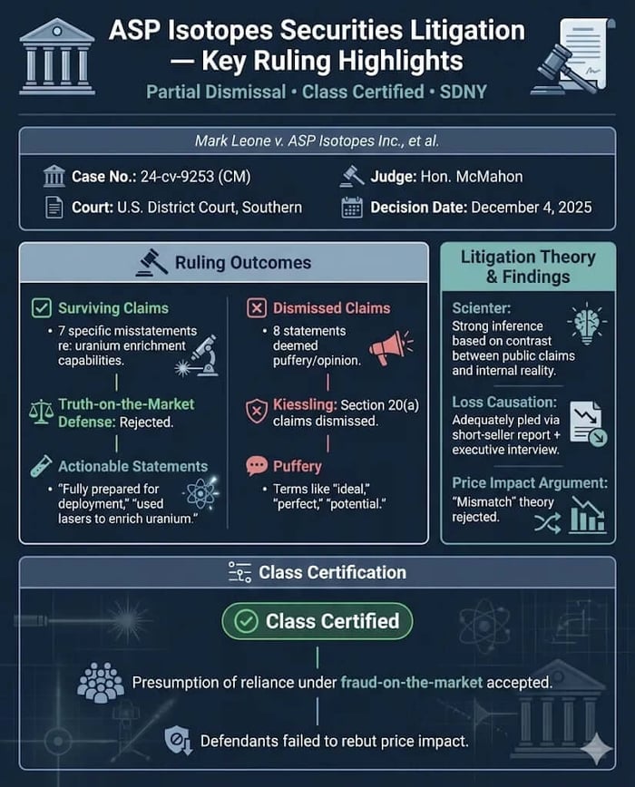 On December 4, 2025, Judge McMahon granted in part and denied in part the defendants' motion to dismiss in the securities class action against ASP Isotopes Inc.. The Court dismissed claims regarding vague statements of optimism but allowed claims concerning the company's uranium enrichment capabilities to proceed. Additionally, the Court granted the plaintiffs' motion for class certification.