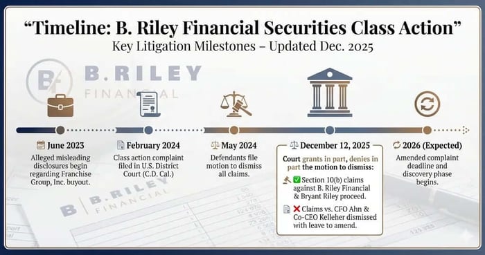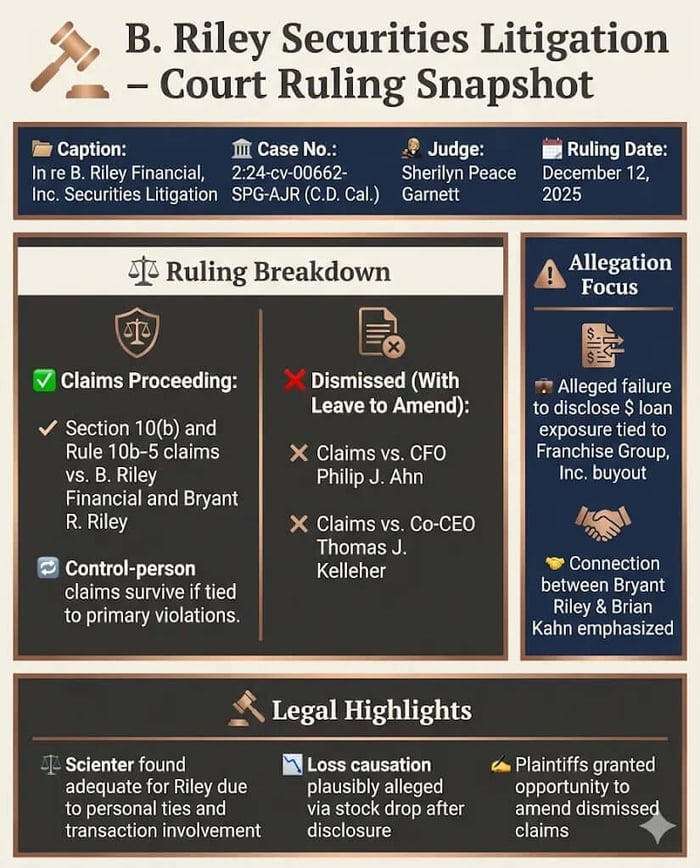 The case continues in part. Section 10(b) claims against B. Riley Financial, Inc. and Bryant Riley remain pending, while claims against the other individual defendants have been dismissed at the pleading stage. The dismissed claims were dismissed with leave to amend, allowing plaintiffs one additional opportunity to cure the deficiencies identified in the order.