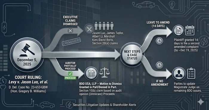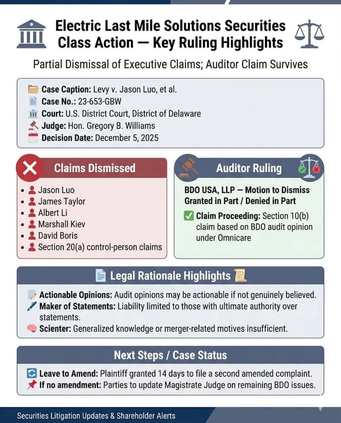 On December 5, 2025, Judge Gregory B. Williams adopted in part and rejected in part a Report and Recommendation regarding motions to dismiss in the securities class action involving Electric Last Mile Solutions, Inc. (ELMS). The Court granted the motions to dismiss filed by individual defendants Jason Luo, James Taylor, Albert Li, Marshall Kiev, and David Boris. The Court granted in part and denied in part the motion filed by the auditor, BDO USA, LLP.