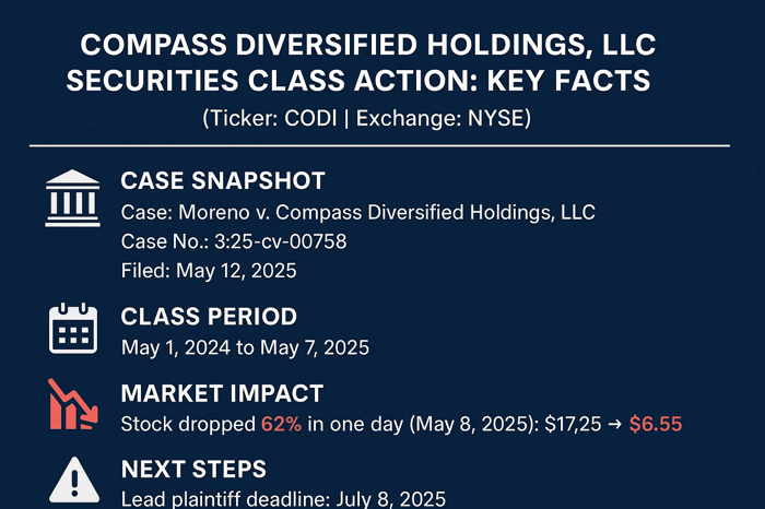 A securities class action lawsuit has been filed against Compass Diversified Holdings, LLC (NYSE: CODI) on behalf of investors who purchased the Company’s stock between May 1, 2024 and May 7, 2025 (the “Class Period”). The lawsuit alleges that Compass and certain executives violated federal securities laws by failing to exercise adequate internal controls over the company's financial reporting, particularly concerning Lugano Diamonds & Jewelry, Inc.