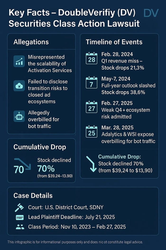 DoubleVerify’s stock declined more than 70% across three major disclosures between February 2024 and February 2025, falling from $39.24 to $13.90 per share.