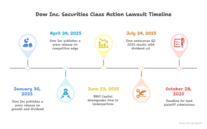 A federal securities fraud class action has been filed against Dow Inc. (NYSE: DOW) and related defendants. The proposed class covers investors who bought Dow securities from January 30, 2025 through July 23, 2025, both dates inclusive. Investors allege the Company overstated its ability to navigate macroeconomic and tariff headwinds, maintain financial flexibility, and protect an industry-leading dividend, while understating competitive and pricing pressures, softening demand, and oversupply. The narrative broke when, after a June analyst downgrade citing dividend pressure, Dow's July results showed a larger-than-expected loss, a year-over-year sales decline, and a 50% dividend cut. On these disclosures, Dow's stock fell 3.21% on June 23 and then 17.45% on July 24, allegedly harming investors who purchased at inflated prices.