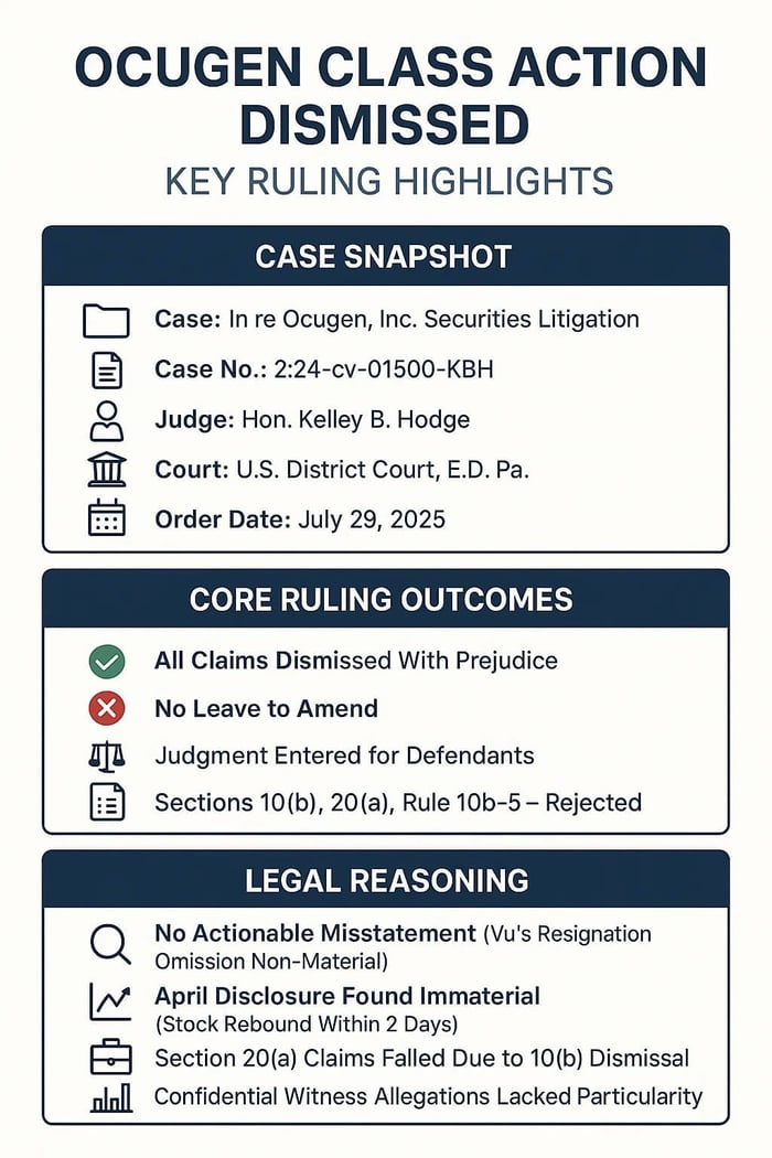 On July 29, 2025, Judge Kelley B. Hodge granted Ocugen Inc.’s motion to dismiss. Judge Hodge held plaintiffs didn’t adequately plead materiality, falsity, or any actionable misstatement. Plaintiffs’ case was dismissed with prejudice, which ends the case.
