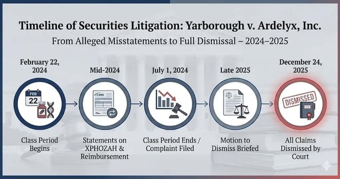 Plaintiffs alleged that Ardelyx and certain executives made false or misleading statements during the class period from February 22, 2024, through July 1, 2024. The complaint focused on statements concerning Ardelyx’s intent to apply for transitional Medicare reimbursement for its drug XPHOZAH and alleged that defendants concealed a prior decision not to pursue that pathway. Plaintiffs also asserted insider trading and control-person claims based on executive stock sales.