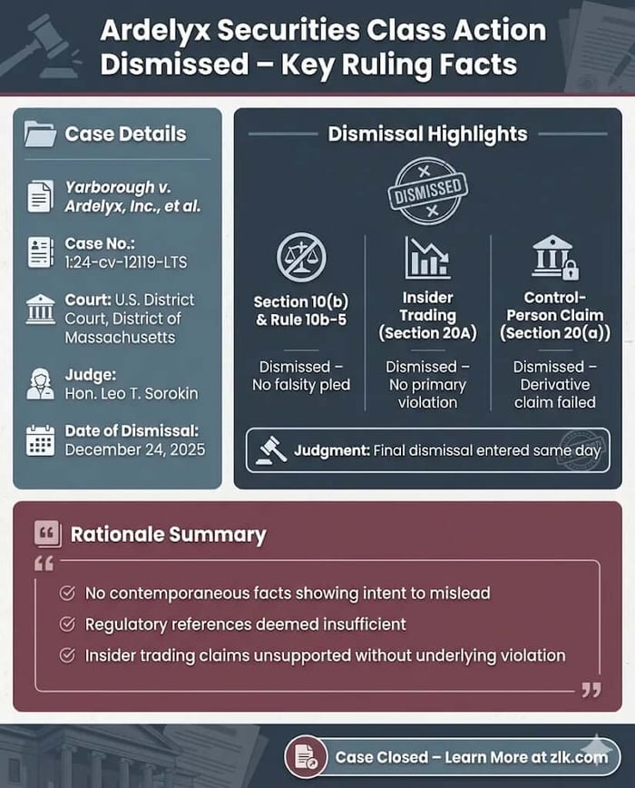 On December 24, 2025, Judge Leo T. Sorokin granted defendants’ motion to dismiss the amended complaint in the securities class action against Ardelyx, Inc. The Court dismissed all claims asserted under the Exchange Act. A separate judgment of dismissal entered the same day, terminating the action.