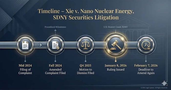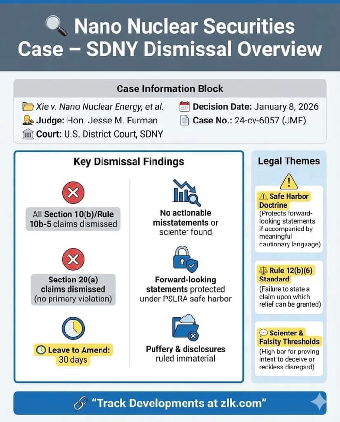 On January 8, 2026, Judge Jesse M. Furman granted defendants’ motion to dismiss the securities class action against Nano Nuclear Energy. The Court dismissed all Exchange Act claims under Section 10(b) and Rule 10b-5, as well as derivative control-person claims under Section 20(a). The dismissal was without prejudice, and plaintiffs were granted one final opportunity to amend within thirty days.