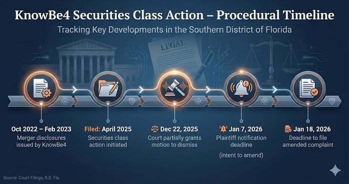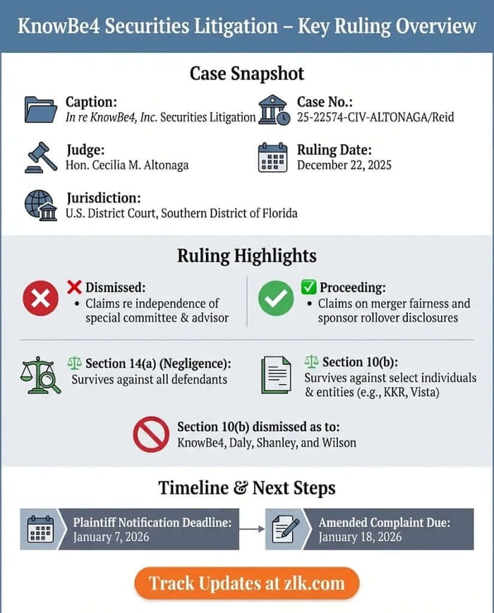 On December 22, 2025, Judge Cecilia M. Altonaga granted in part defendants’ motion to dismiss the consolidated amended complaint in the securities class action challenging disclosures made in connection with KnowBe4’s take-private merger. The Court dismissed certain Exchange Act claims while allowing others to proceed. The Court expressly granted plaintiffs leave to amend and set deadlines for further pleading.
