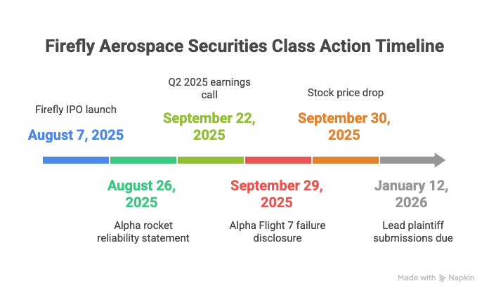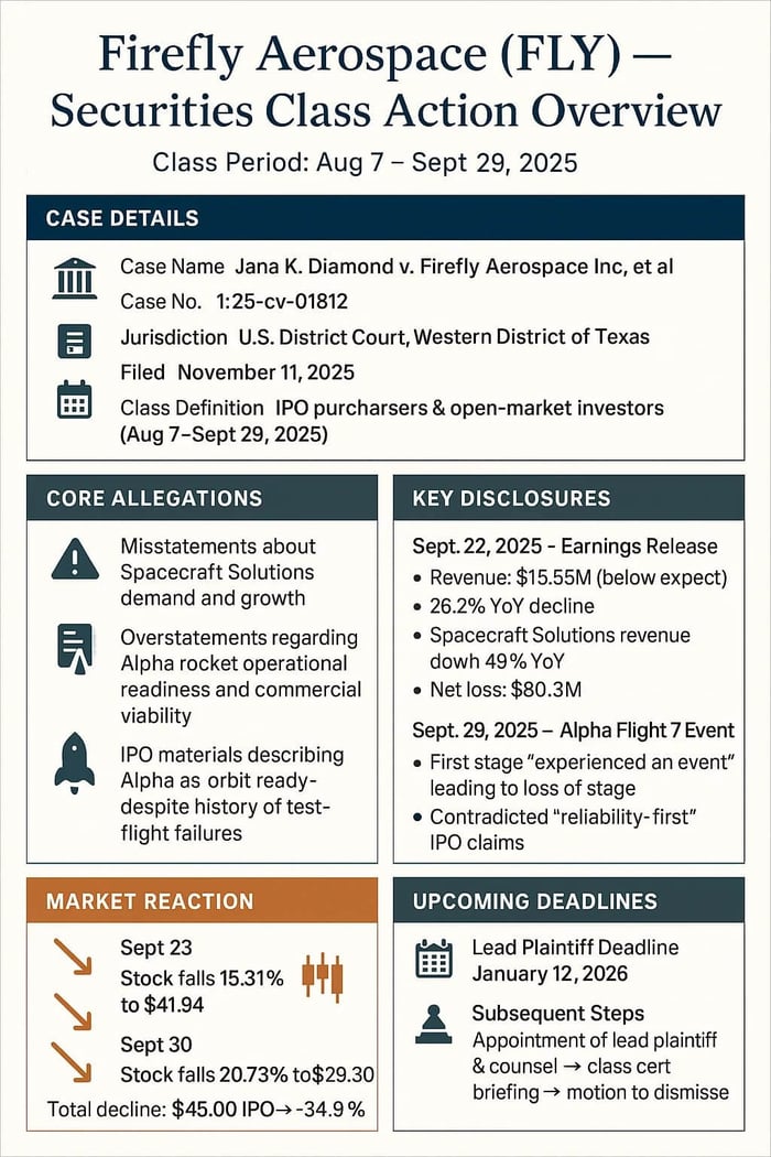 A federal securities class action has been filed against Firefly Aerospace Inc. (NASDAQ: FLY). The case arises in connection with Firefly's August 7, 2025 initial public offering at $45.00 per share and subsequent trading. The putative class period spans August 7, 2025 through September 29, 2025, both dates inclusive. Investors allege Defendants misrepresented the demand and growth of Spacecraft Solutions and the operational readiness and commercial viability of the Alpha rocket from the IPO through the class period. The truth surfaced when Firefly's first earnings as a public company showed revenue shortfalls—especially a 49% year-over-year decline in Spacecraft Solutions—and when the Alpha Flight 7 first stage was lost, leaving the stock trading well below the $45 offering price.