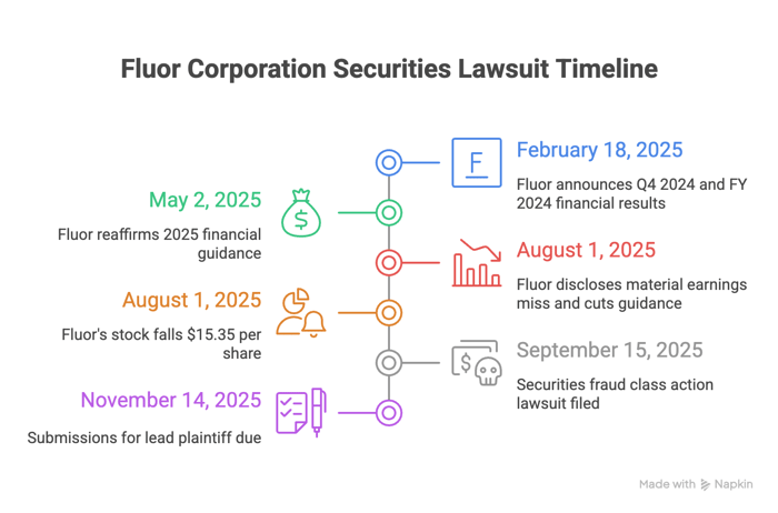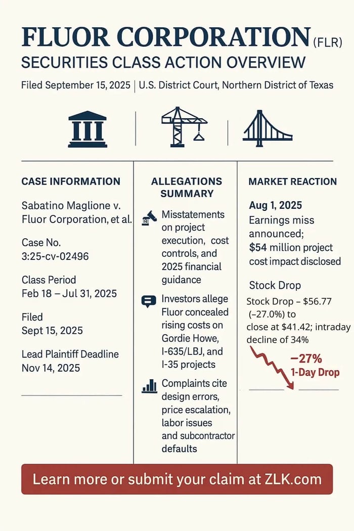 A securities fraud class action has been filed against Fluor Corporation (NYSE: FLR) covering investors who purchased Fluor securities between February 18, 2025 and July 31, 2025. Investors allege the company and senior executives misrepresented project execution, risk controls, and 2025 financial guidance while costs were mounting on key infrastructure jobs. The complaint contends that, despite public confidence, expenses tied to the Gordie Howe, I-635/LBJ, and I-35 projects were rising due to subcontractor design errors, price escalation, labor and scheduling issues, and related delays. On August 1, 2025, Fluor disclosed a material earnings miss, a $54 million net impact from those three projects, and cut its full-year guidance. Following these revelations, shareholders experienced significant losses.