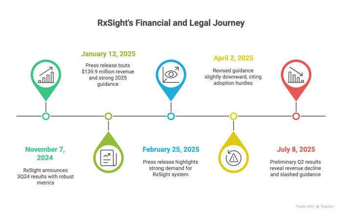 Reality, as alleged in the complaint, diverged sharply. On July 8, 2025, RxSight issued a press release announcing preliminary Q2 2025 results reflecting revenue at $33.6 million—a 4% YoY decline—and a slashed full-year guidance from $160-175 million to $120-130 million. This $42.5 million midpoint cut exposed overstated demand, with LDD sales and LAL utilization faltering amid structural issues in post-operative infrastructure. On the Q2 2025 earnings call, Kurtz disclosed that "adoption challenges over the last few quarters" as the "primary reason for the LDD stall."