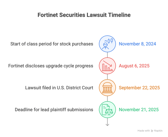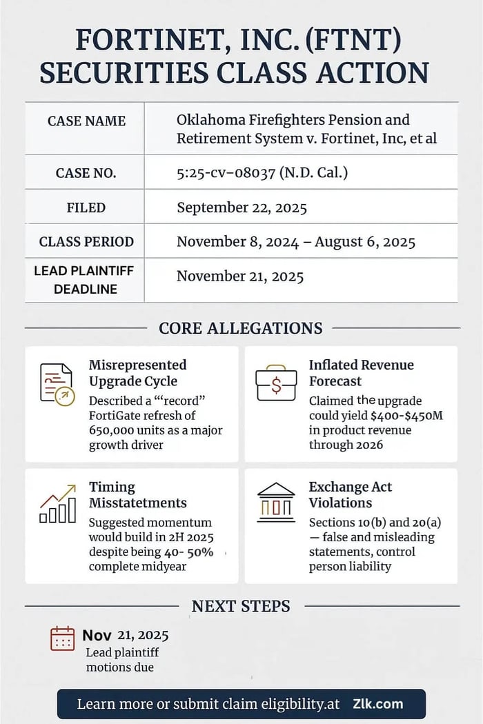 A securities fraud class action has been filed against Fortinet, Inc. (NASDAQ: FTNT) on behalf of investors who purchased Fortinet common stock from November 8, 2024 through August 6, 2025, inclusive. Investors allege the company misrepresented the size, timing, and business impact of a purportedly "record" FortiGate firewall upgrade cycle involving roughly 650,000 units—about one quarter of all FortiGate devices. According to the complaint, executives projected hundreds of millions in product revenue and said upgrade momentum would build into the second half of 2025. On August 6, 2025, Fortinet disclosed the company was already 40% to 50% through the cycle by the end of the second quarter, admitted it was hard to predict the total number of devices needing upgrades, and acknowledged the refresh involved older products with limited impact. The next day, Fortinet's stock fell over 22%, allegedly harming investors who bought at prices inflated by these statements.