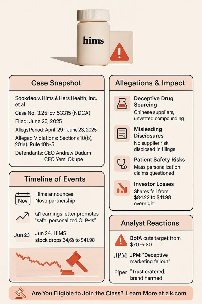 What Hims failed to tell investors was Hims marketed compounded semaglutide from unapproved Chinese suppliers, not Novo Nordisk’s authorized chain. The complaint says these omissions inflated Hims’ stock price, hiding a looming regulatory collapse.