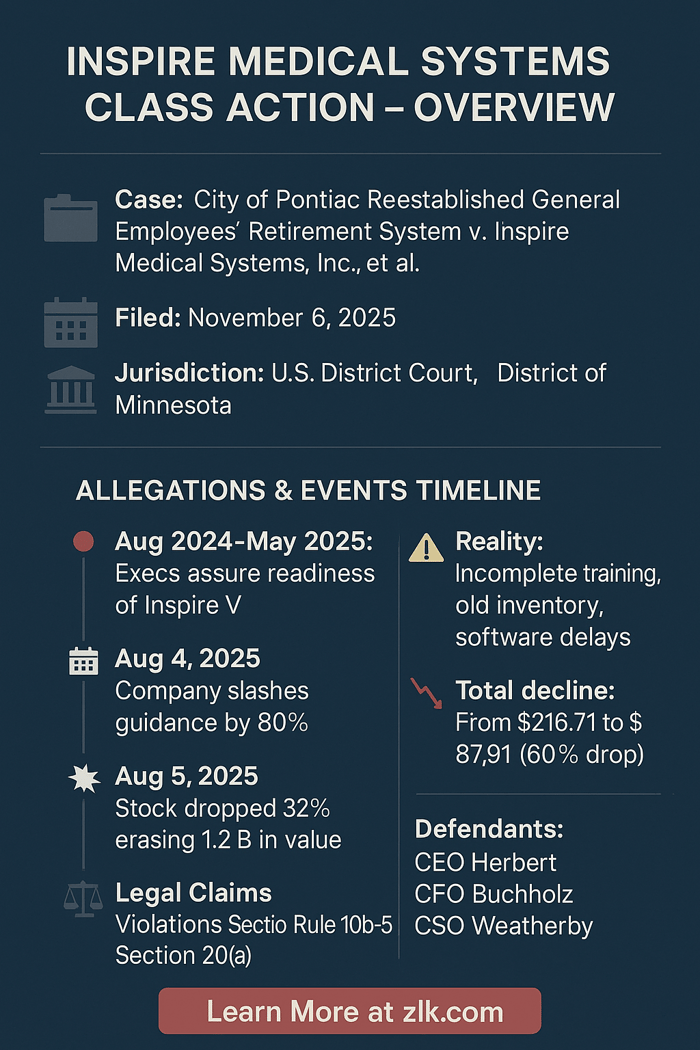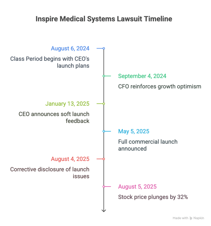 This action, filed in the United States District Court for the District of Minnesota, alleges that Inspire and its top executives knowingly concealed critical failures in the Inspire V rollout throughout the Class Period, from August 6, 2024, through August 4, 2025. The core accusation is stark: the launch was a "disaster," hampered by unexpected poor demand and a fundamental failure to complete necessary operational groundwork, including provider training and key software updates for Medicare reimbursement. When the truth could no longer be contained, the company was forced to slash its 2025 earnings guidance by more than 80%, wiping out roughly $1.5 billion in shareholder value in a single day of reckoning.