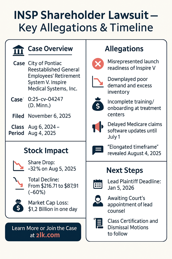 A federal securities fraud class action has been filed against Inspire Medical Systems, Inc. (NYSE: INSP) covering purchases from August 6, 2024 through August 4, 2025. Investors allege the company and senior executives misrepresented the readiness, demand, and success of the launch of its "next generation" sleep apnea device, Inspire V. According to the complaint, management repeatedly assured the market that regulatory, technical, and commercial conditions were satisfied and that payer policies and reimbursement were in place. On August 4, 2025, Inspire disclosed an "elongated timeframe" for the launch, admitting widespread gaps in training and onboarding, delayed claims software updates for Medicare billing until July 1, and poor demand amid excess inventory. The next day, the stock fell more than 32%—a $42.04 drop to $87.91—wiping out $1.2 billion in market value.