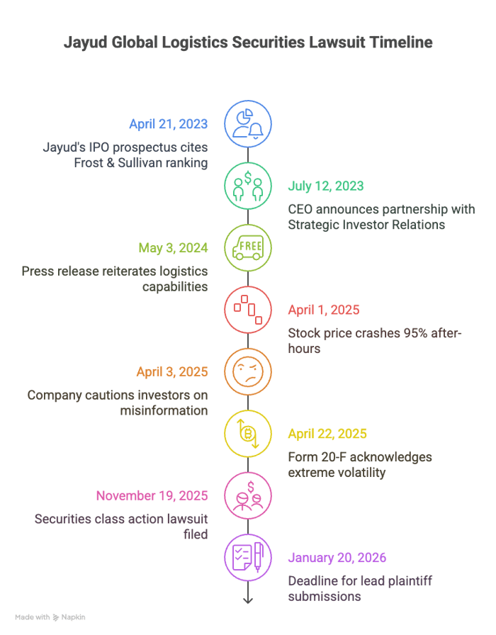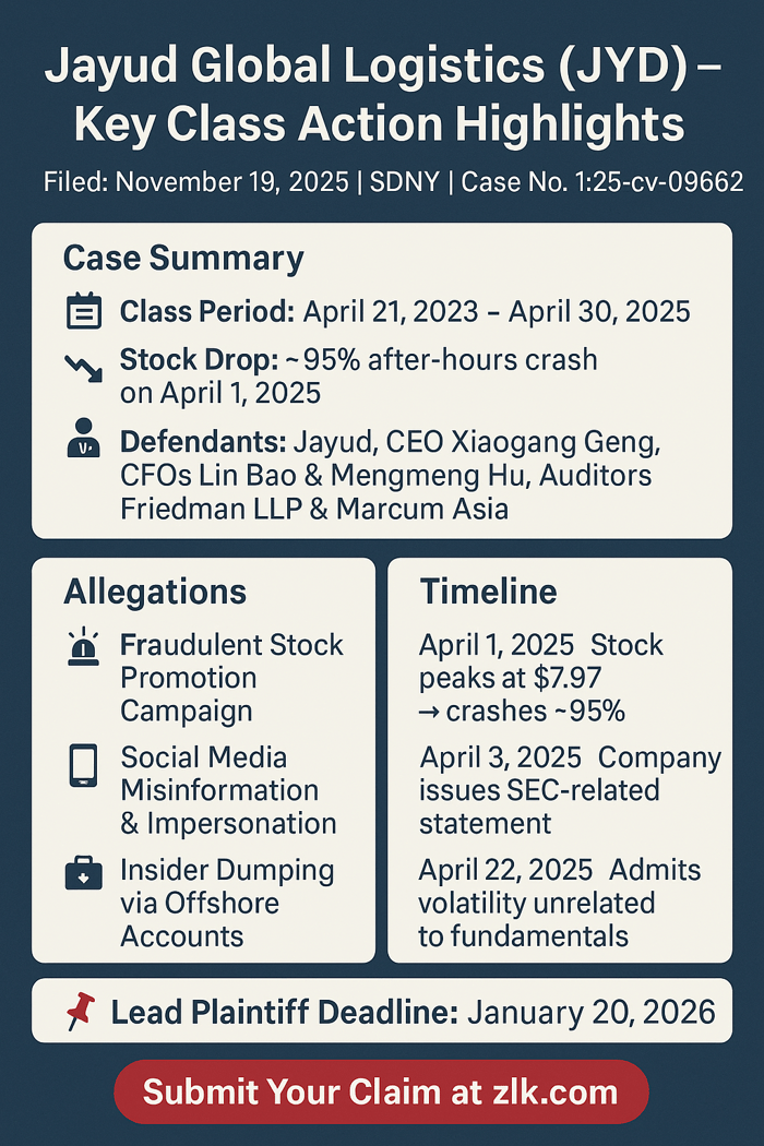 A securities fraud class action has been filed against Jayud Global Logistics Limited (NASDAQ: JYD) in the U.S. District Court for the Southern District of New York. The case covers investors who acquired Jayud securities between April 21, 2023 and April 30, 2025. Investors allege the Company and its leaders misled the market about Jayud's business, operations, and critically, the true nature of trading in its stock, while failing to disclose a social media-driven stock promotion campaign and coordinated selling by insiders or affiliates. The truth surfaced as Jayud's share price abruptly collapsed about 95% during after-hours trading on April 1, 2025, followed by Company statements on April 3 and April 22, 2025 acknowledging extreme volatility and risks tied to misinformation unrelated to fundamentals. Investors allege they bought at artificially inflated prices and were damaged when the price fell.