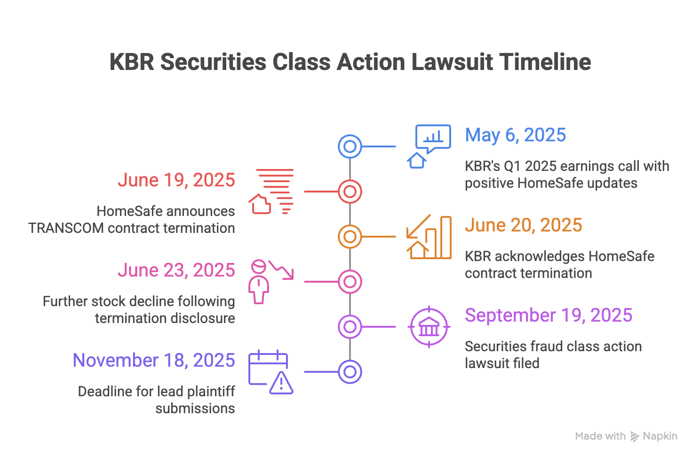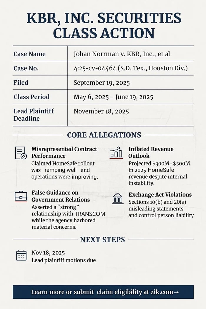 A securities fraud class action has been filed against KBR, Inc. (NYSE: KBR) covering May 6, 2025 to June 19, 2025. Investors allege the company misrepresented the status and performance of its HomeSafe Alliance (“HomeSafe”) joint venture under the U.S. Department of Defense's Global Household Goods Contract, including claims of a strong relationship with Transportation Command (“TRANSCOM”), improving operations, and a 2025 revenue ramp. The complaint states that, for months, TRANSCOM had material concerns about HomeSafe's ability to fulfill the contract, contradicting the upbeat narrative. The truth surfaced when HomeSafe announced on June 19, 2025 that TRANSCOM terminated the contract and KBR issued a press release acknowledging the termination the next day. Following these disclosures, the stock dropped over two trading sessions, allegedly harming investors.