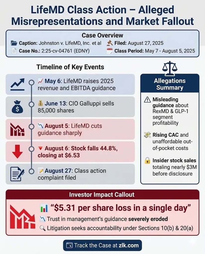 The revised guidance was drastically lower, with total revenue expectations being reduced to a range of $250 million to $255 million and Adjusted EBITDA reduced to a range of $27 million to $29 million. The next day, August 6, 2025, the price of LifeMD common stock fell $5.31 per share, or 44.8%, closing at $6.53. The Class Action Complaint was officially filed on August 27, 2025.