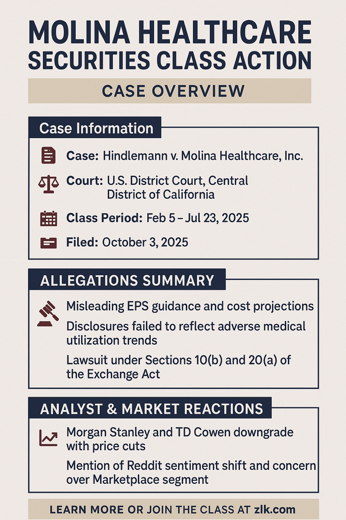 Wall Street financial analysts were quick to react. Morgan Stanley cut its rating on Molina to “Equal-Weight” and slashed its price target from $364 to $266, citing deteriorating cost assumptions. Meanwhile, TD Cowen downgraded MOLINA from “Buy” to “Hold,” setting a target of $203, after raising its estimate for Molina’s medical loss ratio (MLR) to ~89.5%. These cautionary views reinforce the class’s core argument: that Molina’s cost assumptions were overly optimistic and materially misleading.