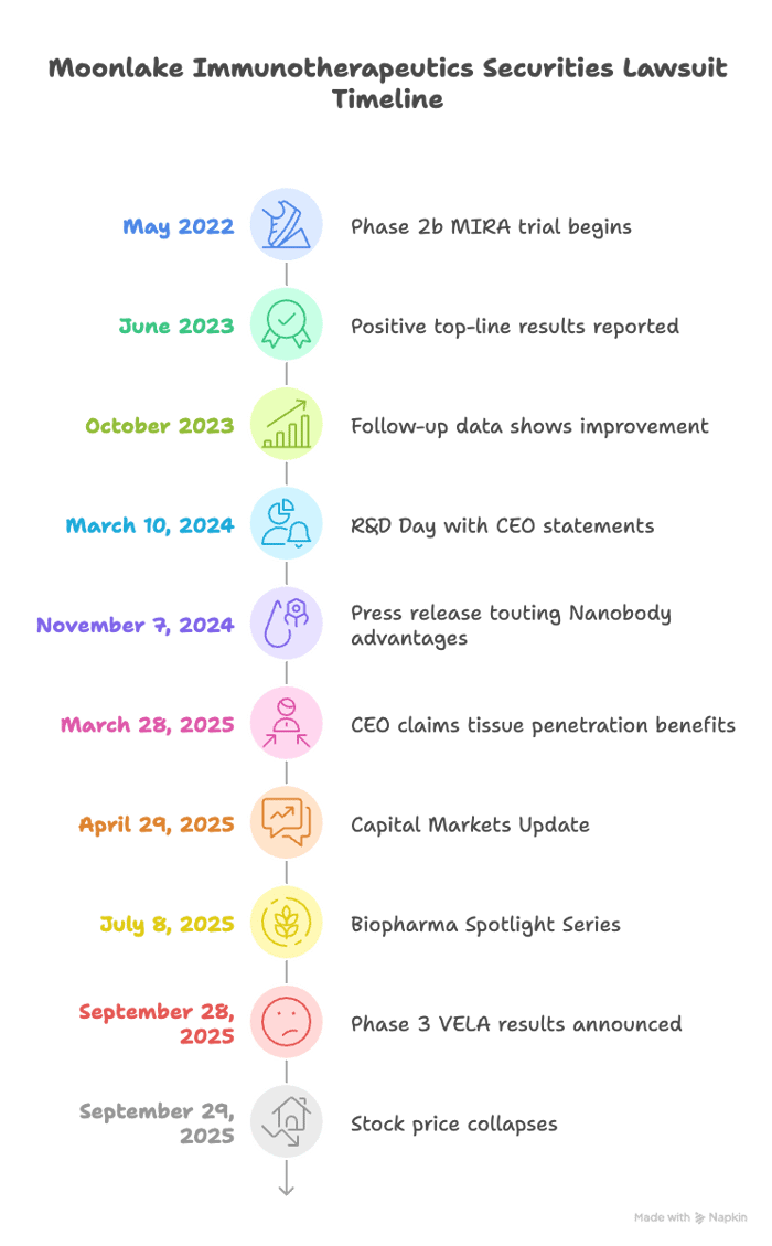 According to the complaint, investors are suing Moonlake Immunotherapeutics, its Chief Executive Officer Jorge Santos da Silva, and its Chief Financial Officer Matthias Bodenstedt over statements made as the company advanced sonelokimab. The story began in May 2022, when Moonlake started its Phase 2b MIRA trial of sonelokimab for moderate-to-severe hidradenitis suppurativa. By June 2023, the company reported positive top-line results meeting its HiSCR75 endpoint, and follow-up data in October 2023 showed further improvement with continued treatment. Early 2024 brought endorsements from both the FDA and EMA for the proposed Phase 3 program, setting the stage for broader claims about the supposed advantages of the company's Nanobody technology.