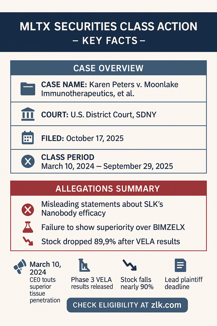 A securities fraud class action has been filed against Moonlake Immunotherapeutics (NASDAQ: MLTX) covering March 10, 2024 through September 29, 2025. Investors allege the company and its leadership misrepresented that sonelokimab's "Nanobody" design delivered superior clinical benefits and tissue penetration over monoclonal antibodies like BIMZELX, despite sharing the same IL-17A/IL-17F targets. On September 28, 2025, Moonlake announced Phase 3 VELA results that failed to show competitive efficacy versus BIMZELX, contradicting the touted advantages. The next trading day, Moonlake's stock price collapsed. Investors allege significant losses followed these revelations.