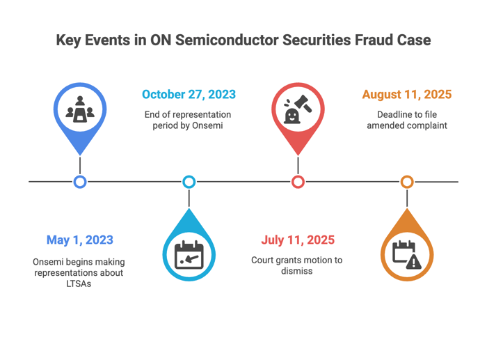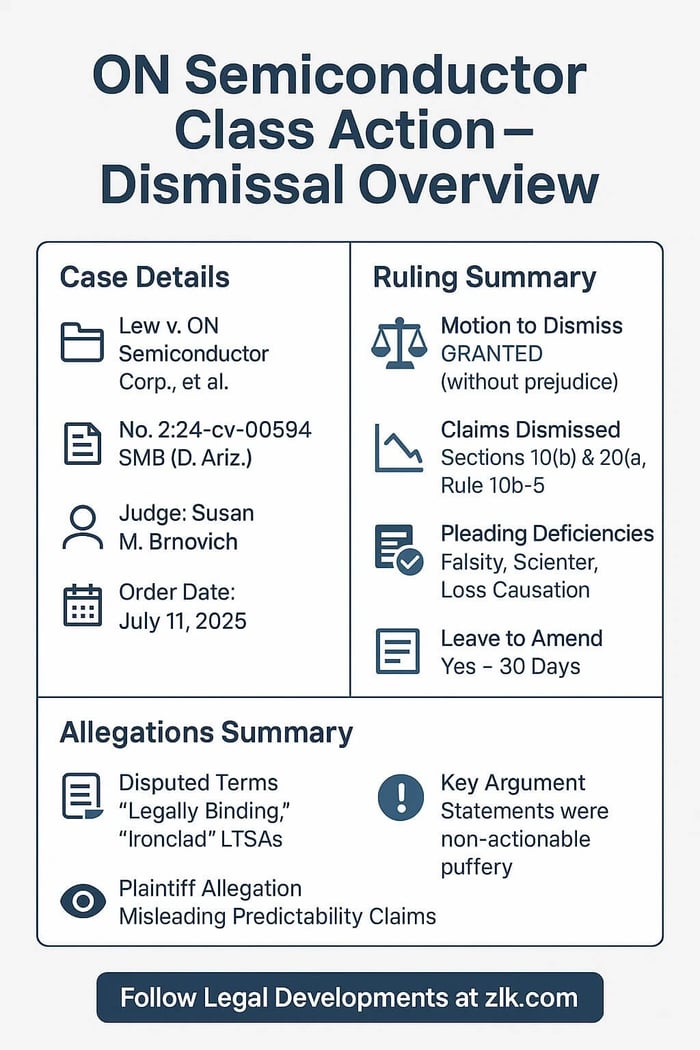 A federal judge in Arizona has dismissed, without prejudice, a securities fraud class action brought against ON Semiconductor Corporation (Onsemi) and two of its executives. The ruling grants defendants’ motion to dismiss in full but allows plaintiffs thirty days to file an amended complaint.