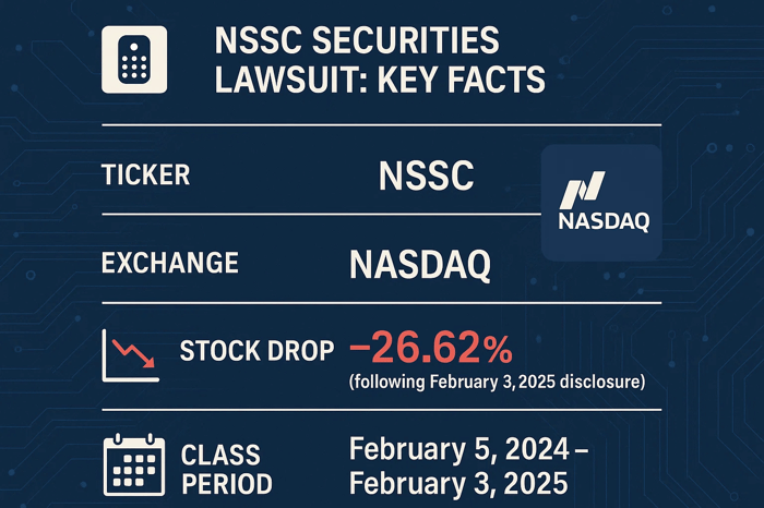 The lawsuit claims Napco misled investors about its ability to forecast hardware demand and achieve its fiscal 2026 EBITDA margin target of 45%, leading to a stock price drop of over 26% on February 3, 2025. This shareholder alert provides key details to help investors understand their rights and next steps.