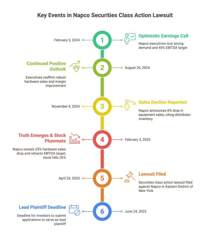 The Napco class action lawsuit represents investors who purchased Napco securities between February 5, 2024, and February 3, 2025 (the Class Period). If you acquired Napco stock during this period, you may be eligible to seek compensation through a contingency fee arrangement, meaning no upfront costs for legal representation. Shareholders have until June 24, 2025, to file submissions to serve as lead plaintiff in this class action lawsuit.