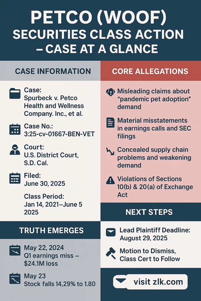 Petco Health and Wellness Company, Inc. (NASDAQ: WOOF) got hit with a securities fraud class action lawsuit. It’s for investors who bought stock between January 14, 2021, and June 5, 2025. The lawsuit claims Petco’s execs lied about riding pandemic pet adoption waves and a pivot toward pet-health conscious consumers. They sold growth like a shiny new leash. Reality bit hard. Stocks sank. Investors lost millions. Shareholders are clawing back losses, raw as a chewed-up bone.