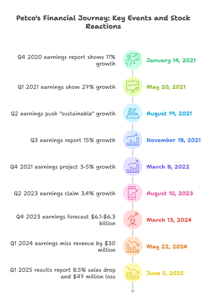 On May 22, 2024, Petco’s Q1 2024 earnings missed revenue by $30 million, posting a $24.1 million net loss. On June 5, 2025, Q1 2025 results reported an 8.5% comp sales drop and a $47 million loss, scrapping 2025 guidance due to “macro softness” and supply issues. Petco’s health-focused hype faded like a worn-out chew toy.