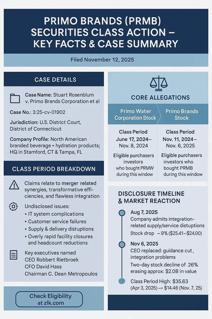 A securities fraud class action has been filed against Primo Brands Corporation (NYSE: PRMB) in the U.S. District Court for the District of Connecticut. The class period includes two parts: June 17, 2024 through November 8, 2024 for Primo Water Corporation stock, and November 11, 2024 through November 6, 2025 for Primo Brands stock. Investors allege the company and its senior executives misled the market about the merger between Primo Water Corporation and an affiliate of BlueTriton Brands, promising accelerated growth, "transformative" efficiencies, meaningful synergies, and even "flawless" integration. The complaint states that, instead, the integration was troubled—marked by technology and customer service issues, supply and delivery disruptions, slashed guidance, and a CEO change. When the truth emerged, the stock fell sharply, including a two-day drop of more than 36% that erased about $2.0 billion in shareholder value.