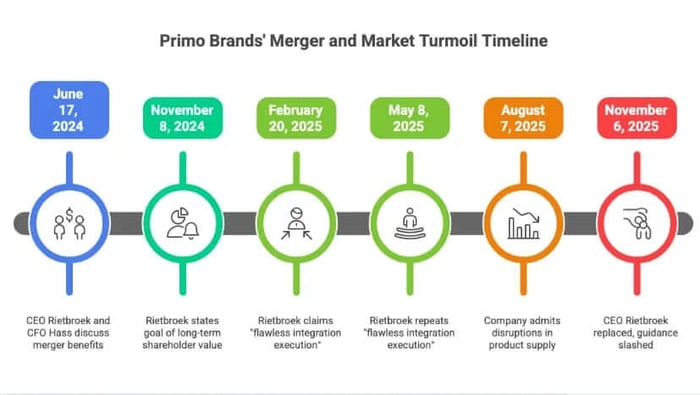According to the complaint, the lawsuit targets Primo Brands Corporation and three senior executives: Chief Financial Officer David Hass, Non-Executive Chairman C. Dean Metropoulos, and CEO Robbert Rietbroek. Throughout the class period, they allegedly told investors that the merger with an affiliate of BlueTriton Brands would accelerate growth, deliver meaningful synergies, achieve "transformative operational efficiencies," and that integration efforts were proceeding smoothly—indeed, "flawlessly."