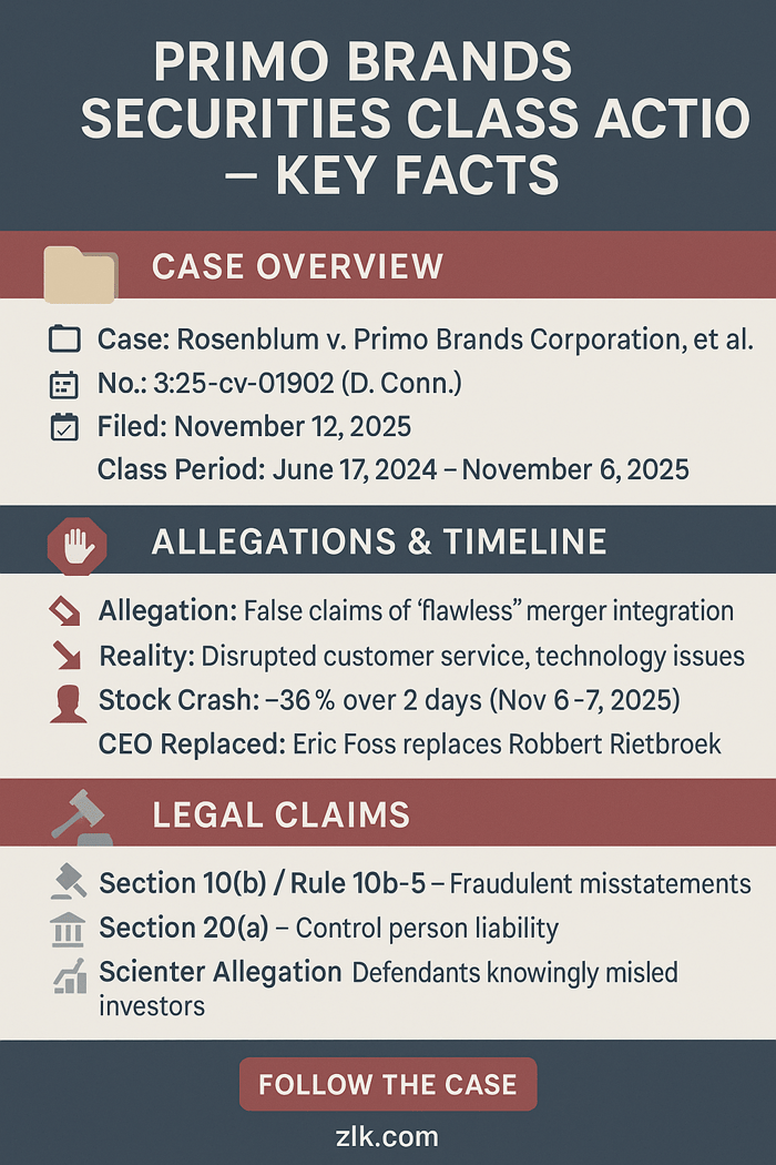 Primo Brands Faces Federal Securities Class Action Over Allegedly “Flawless” Merger Integration