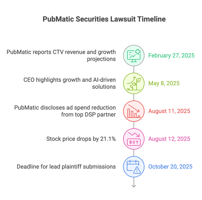 The complaint names PubMatic, Inc., Chief Executive Officer Rajeev K. Goel, and Chief Financial Officer Steven Pantelick. According to investors, defendants painted a picture of accelerating growth and effective disclosure controls while failing to reveal a major shift by a top DSP buyer that was reducing ad spend and revenue.